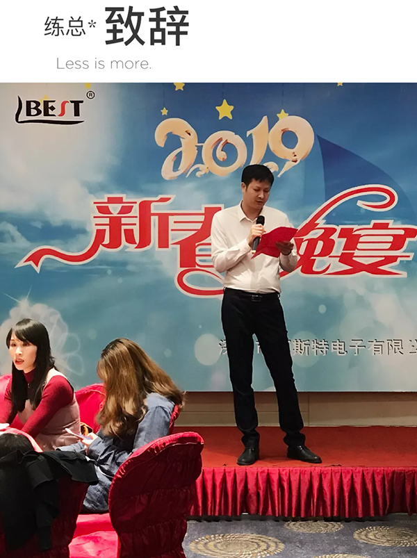 休息后,百斯特電子全員盛裝出席新春晚宴,晚宴在祥和而熱烈的氣氛中開始,首先由公司總經(jīng)理練總致辭,在這辭舊迎新,歡聚一堂的時刻,練總首先向全體員工致以誠摯的祝賀!回首2018,全體員工不辭辛苦,兢兢業(yè)業(yè)。公司的業(yè)務節(jié)節(jié)高升,取得了有目共睹,可喜可賀的成績。2019公司將聚焦現(xiàn)有產(chǎn)品,發(fā)展新產(chǎn)品,只要我們滿懷信心,攜手共進,我們一定能創(chuàng)造一個更加美好的明天!